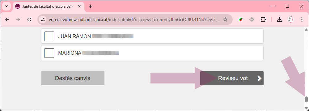 4) Feu clic als candidats/tes que voleu votar, fins al màxim de llocs a cobrir, o no en marqueu cap per votar en blanc, i feu clic al botó "Reviseu vot".