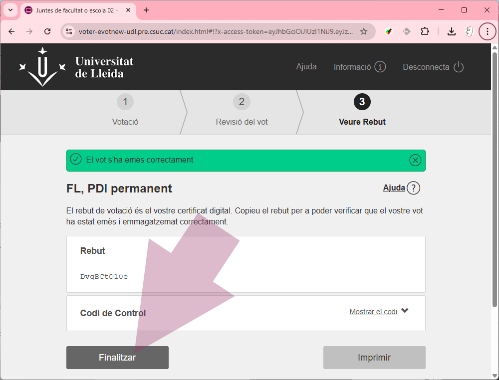 7) Feu clic al botó “Imprimir” per obtenir el vostre rebut de votació i clic al botó “Finalitzar” per finalitzar el procés de votació o per tornar a la llista d’eleccions a les que teniu dret a vot.